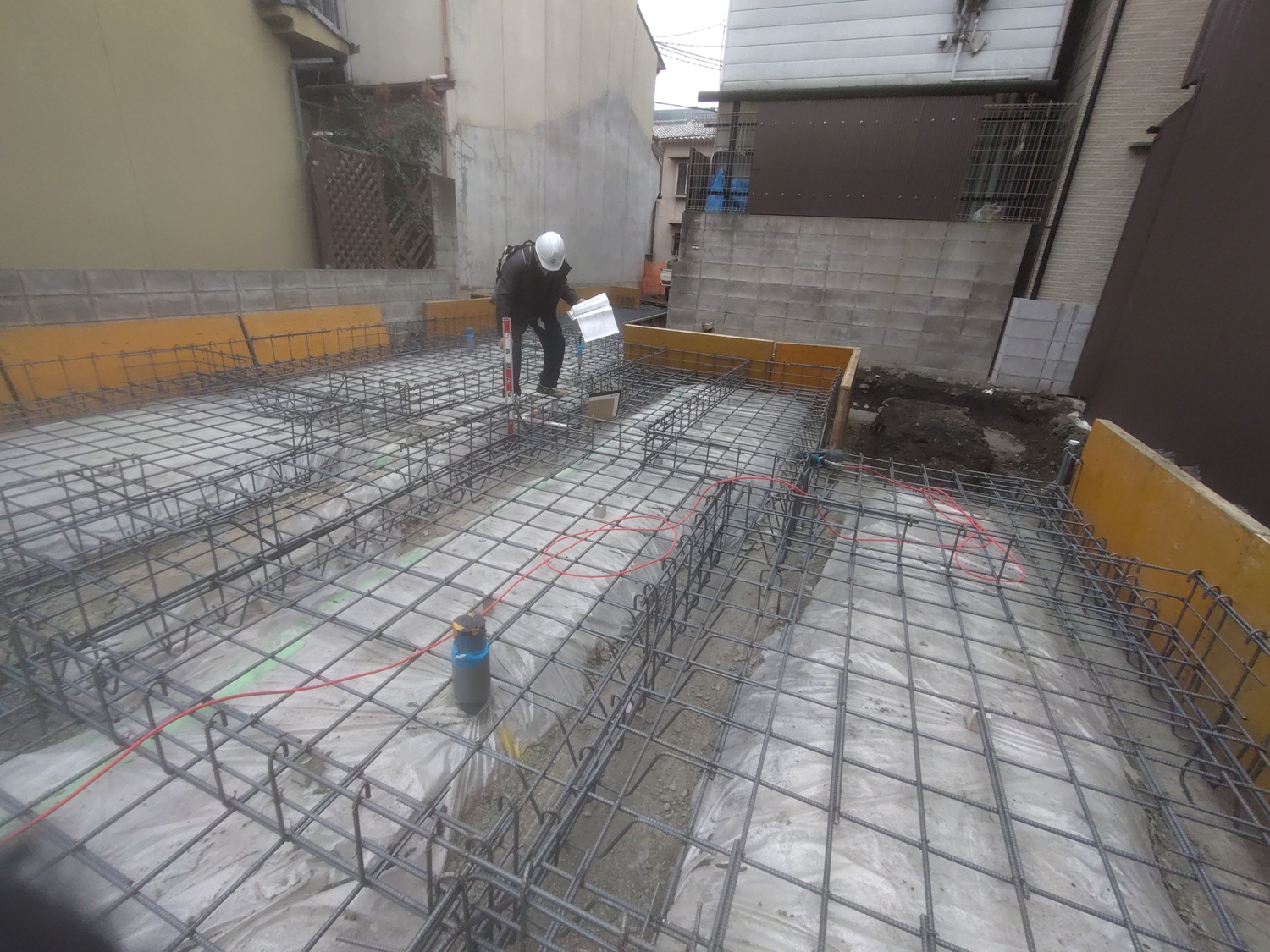 京都市下京区K様邸新築工事の基礎工事を開始しております。掘削・給排水設備工事・配筋工事まで進んでおり昨日,住宅保証機構による配筋検査を受けております。
